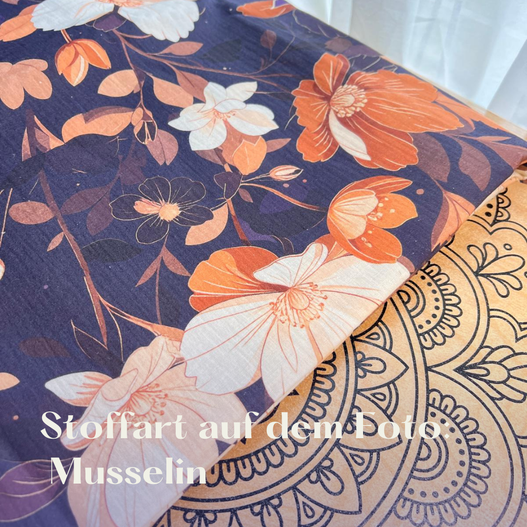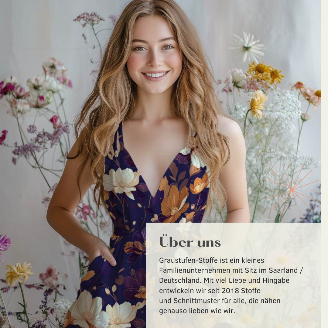 Hier findest du Infomationen zu unseren einzelnen Stoffarten. Jedes Material in unserem Sortiment bringt nicht nur eine einzigartige Zusammensetzung mit sich, sondern auch verschiedene Drucktechnologien, die den Stoffen ihren ganz eigenen Charakter verleihen. Bitte beachte, dass es aufgrund der unterschiedlichen Materialien und Drucktechniken zu Farbabweichungen zwischen den einzelnen Stoffarten kommen kann. Dies ist ganz normal und liegt in der Natur der Sache. Auch die Lichtverhältnisse und deine Bildschirmeinstellungen können die Farbwahrnehmung beeinflussen. Das dargestellten Nähinspirationsbilder zeigen den Stoff als Sommersweat und die Stoffbilder zeigen den Stoff als Musselin.