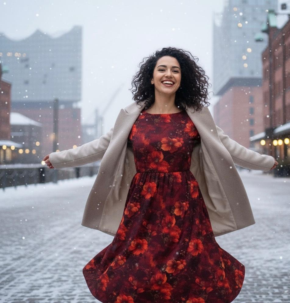 Die tiefroten Blüten, die wie kleine Funken auf dem Stoff leuchten, schenken jedem Nähprojekt eine besondere, fast magische Ausstrahlung. Herzensglut ist mehr als ein Stoff – es ist ein Moment für dich selbst. Ein kleines Geschenk, das sagt: Ich verdiene etwas Schönes.